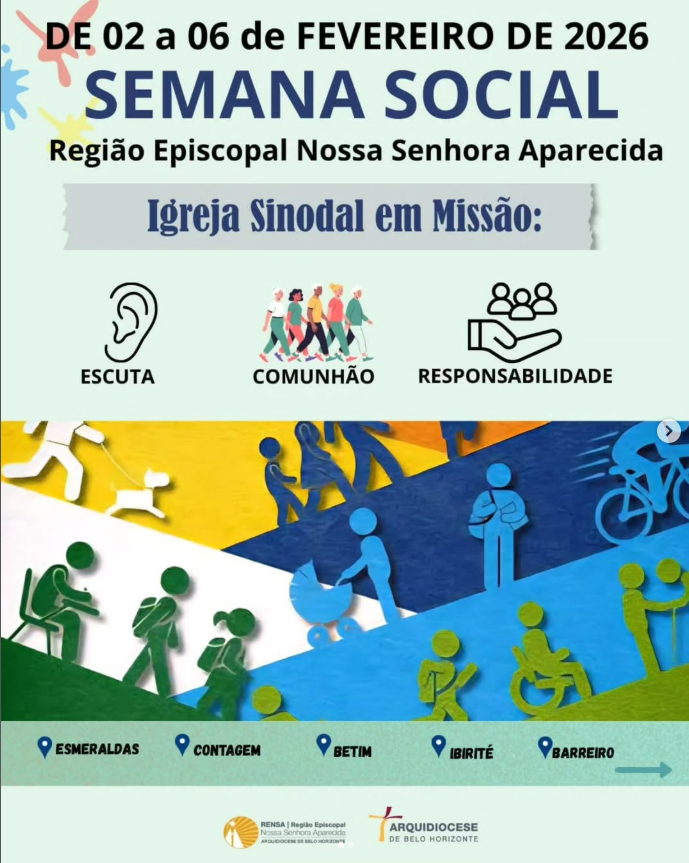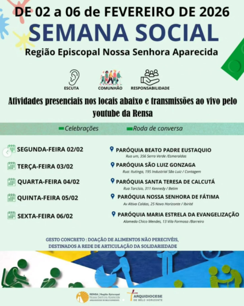A Região Episcopal Nossa Senhora Aparecida (Rensa) convida para a Semana Social, de 2 e 6 de fevereiro, com encontros presenciais e transmissão ao vivo pelo canal da Região no YouTube.